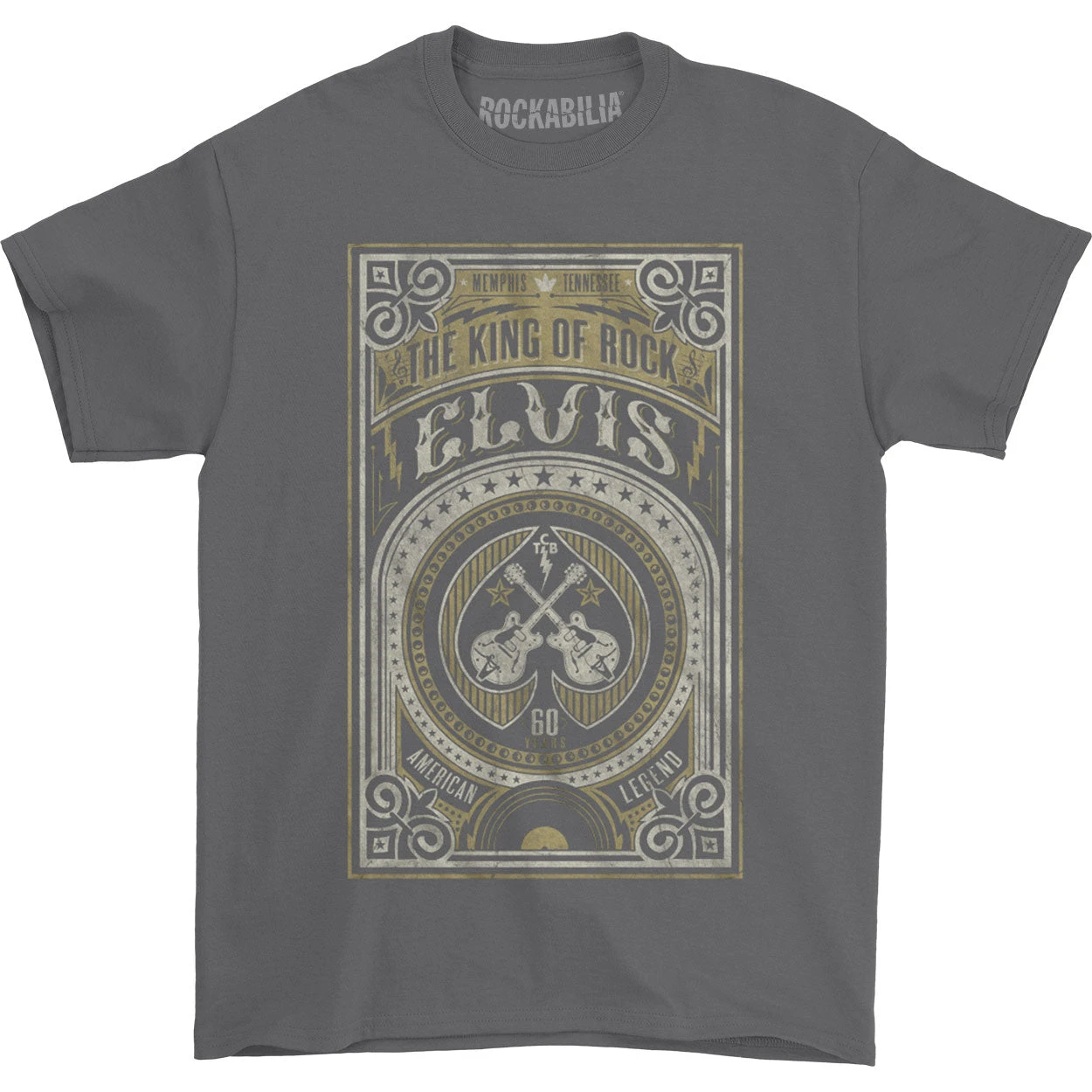 Vintage Distressed Memphis Tennessee The King Of Rock American Legend 60 Years TCB Logo With Crossed Guitars Within Spade & Seal Of Stars Boxed Art